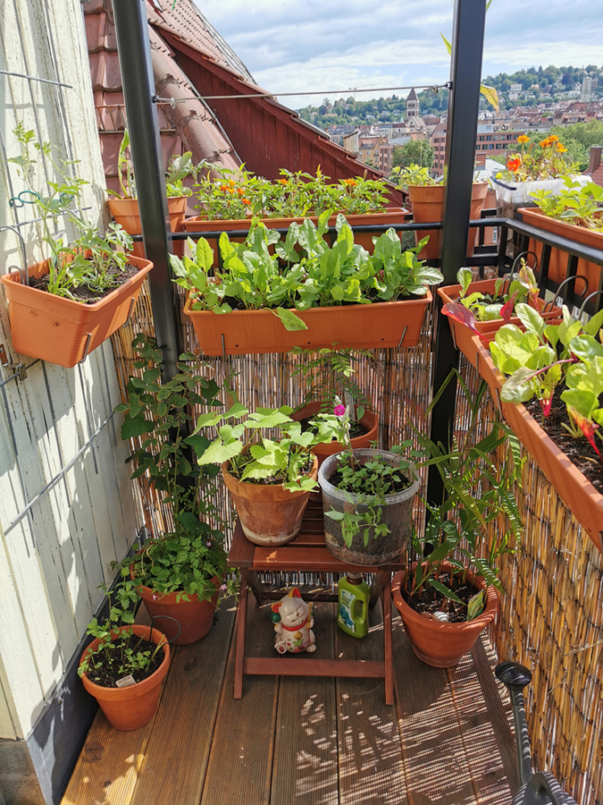 Mit ausreichend tiefen Gefäßen kannst du auch die Wurzelschicht einplanen. Manchmal, wie beim sehr ausbreitungsfreudigen Topinambur, ist das sogar ratsam. Der kommt übrigens immer wieder und wird hoch genug, um als Sicht- und Windschutz für dich in Einsatz zu gehen. Radieschen und runde Möhrchen gehen auch in Balkonkästen und Kartoffeln in großen Töpfen.